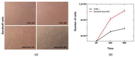 Images in brightfield (10× objective magnification) of untreated Sandhoff cells (CTRL−) and HexA-NP treated Sandhoff cells at 24 and 48 h (panel (a)) and relative growth curves (panel (b)). Data are reported as mean ± SEM, n = 3.