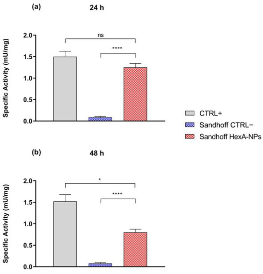 Specific activity (mU/mg) toward the artificial substrate MUGS of healthy human fibroblasts (CTRL+), untreated Sandhoff cells (CTRL−), and HexA-NP treated Sandhoff cells after 24 h (panel (a)) and 48 h of treatment (panel (b)). Data are reported as mean ± SEM, n = 3. ns = difference is not statistically significant, * p < 0.05, **** p < 0.0001.