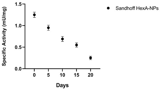 Specific activity (mU/mg) over time toward the artificial substrate MUGS of HexA-NP treated Sandhoff cells. Data are reported as mean ± SEM, n = 3.