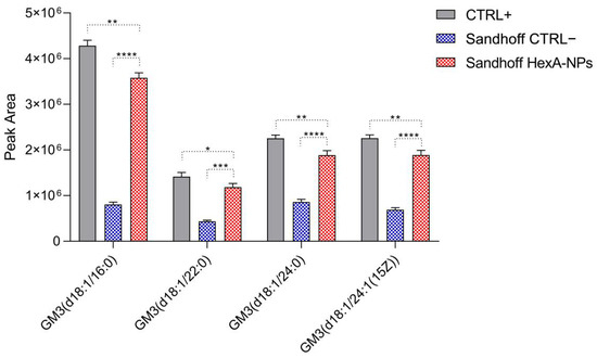 The effective in vitro functioning of the HexA-NP system was then evaluated in terms of the ability of the administered enzyme to act against its natural substrate: the GM2 ganglioside. Q-TOF LC/MS analysis was thus carried out to search for the presence of different GM3 ganglioside species produced upon GM2 degradation in the treated cells after 24 h. Figure 8 shows the abundance histograms of the main GM3 ganglioside species detected in healthy HFs (CTRL+), untreated Sandhoff cells (CTRL−), and HexA-NP treated Sandhoff cells.