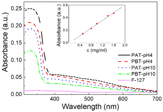 UV-Vis absorption spectra for the four pluronic-TiO2 dispersions studied in this work. For comparison, the absorption spectrum of a pluronic-F127 water solution (PA) is also reported. In the inset, the calibration plot for TiO2 is shown.