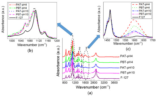 FTIR-ATR spectra for pluronic-F127 and pluronic-TiO2 dispersions in the dry state in the whole range 700–4000 cm−1(a). In (b,c), two magnified views in the range 980–1200 and 1430–1700 cm−1 are reported, respectively.