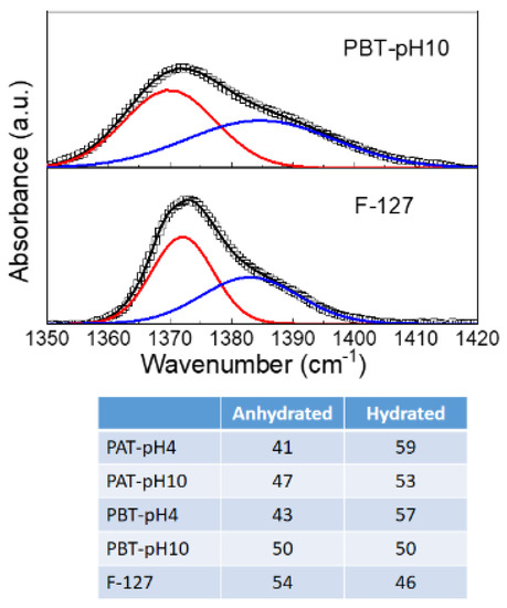 Representative deconvolution for dry pluronic F127 and PBT-pH10 into two Gaussian components representing the anhydrated (~1371 cm−1) and hydrated (~1383 cm−1) state of methyl groups. The experimental data are reported as squares, the best fit and the Gaussian components as continuous lines. Bottom: Integrated peak areas of the anhydrous and hydrated Gaussian component for all the samples investigated.