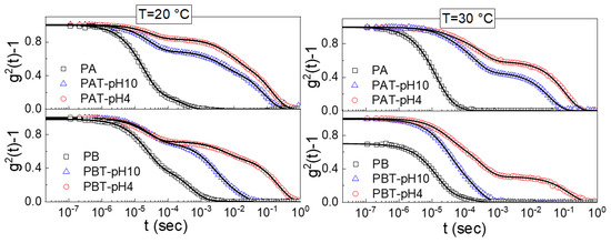 According to the fit results, it was found that regardless of the pluronic concentration, temperature or pH, a fast relaxation occurs for all the samples on the time scale of 2.5·10−5–3.0·10−5 s. This fast decay seems to be a common characteristic of other pluronic-based nanoparticle systems. It has been ascribed to freely diffusing pluronic unimers with a radius of nearly 2 nm [43,44,45,46,47,48,49,50,51,68]. What profoundly differentiates the pluronic water systems from the pluronic-TiO2 ones is the population of unimers which is drastically reduced in the presence of TiO2.