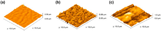 Figure 2. Atomic Force Microscopy (AFM) analysis of surface topography for (a) unmodified Ti; (b) TNT; (c) TNT-DP-Ica. The roughness increased in the following order: Ti (54 nm) < TNT (95 nm) < TNT-DP-Ica (159 nm).