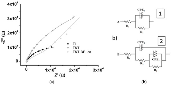 To establish the electrochemical behaviour of the tested samples, electrochemical impedance spectroscopy (EIS) was performed. In Figure 3, the Nyquist diagrams and equivalent circuits proposed for data fitting are presented. As can be observed from Figure 3b, two different electrical circuits were proposed: one for the unmodified Ti sample (1) and another one for the TNT and TNT-DP-Ica supports (2).