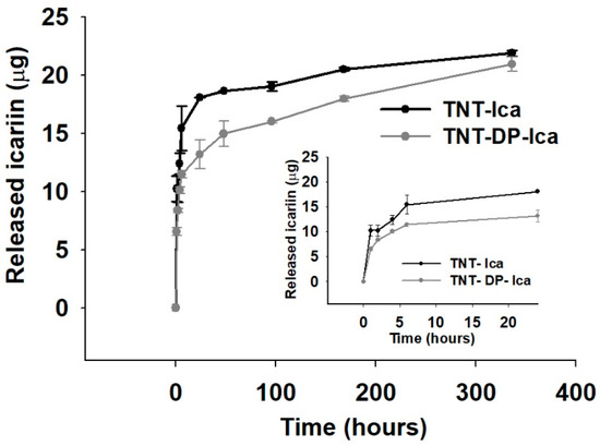 Figure 4. The in vitro release of Ica-loaded samples (TNT-Ica and TNT-DP-Ica), monitored at the predetermined time points of 1, 2, 4, 6 h; and 1, 2, 4, 7, and 14 days in a PBS solution (pH 7.4). Results are presented as means ± SD. For each interval of time, three samples were tested. After 7 days, the Ica released exhibited by TNT-DP-Ica was still in progress, due to the better linking properties of polydopamine.