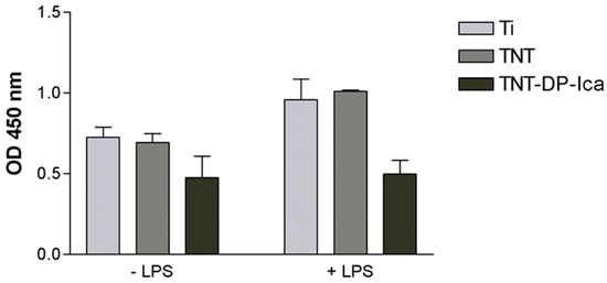 Figure 5. CCK-8 assay highlighting the viability of the RAW 264.7 cells grown in direct contact with the analysed samples (flat Ti; TNT; TNT-DP-Ica) for 24 h, under standard (−LPS) and pro-inflammatory (+LPS) conditions. Data analysis was based on mean ± SD (n = 3).