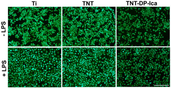 Figure 6. Viability of the RAW 264.7 cells grown directly on the surface of the flat T, TNTs and TNT-DP-Ica supports for 24 h, under standard (−LPS) and inflammatory (+LPS) conditions. The Live & Dead assay highlighted the presence of viable cells (green fluorescence) on all of the tested supports, with no visible red fluorescence specific for dead cells. Scale bar represents 100 µm.