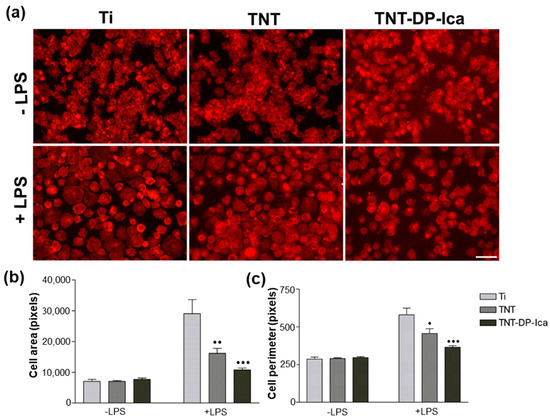 Figure 7. (a) Representative fluorescence images of morphological features exhibited by macrophages seeded directly on the surface of the tested samples (flat Ti, TNT, TNT-DP-Ica) after 24 h of culture under standard (−LPS) and pro-inflammatory (+LPS) conditions. Labelling of the actin cytoskeleton with phalloidin conjugated with Alexa Flour 546 showed significant morphological changes between the cells grown on the analysed samples, especially under LPS stimulation, with the nanostructured surfaces being able to attenuate the LPS-induced alternations compared with the flat Ti sample. Scale bar represents 50 µm; (b) Quantification of cell spreading area; (c) Statistical results of macrophage perimeter. Data analysis was based on mean ± SD (n = 20, • p < 0.05, •• p < 0.01, ••• p < 0.001 vs. Ti).