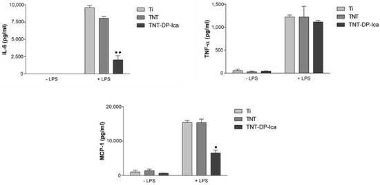 Figure 8. The extracellular levels of IL-6, TNF-α, and MCP-1 accumulated in cell culture medium of macrophages grown for 24 h on the analysed substrates, under standard (−LPS) and pro-inflammatory (+LPS) conditions. In pro-inflammatory (+LPS) conditions, the lowest amounts of cytokines were secreted by the RAW 264.7 cells grown directly on the surface of the Ica-functionalised TNT, while under standard culture conditions (−LPS), very low or non-existing amounts of pro-inflammatory mediators could be quantified. Results are presented as means ± SD (n = 3, • p < 0.05, •• p < 0.01 vs. Ti).