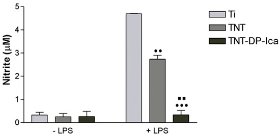 Figure 9. Nitrite concentrations in the cell culture media of macrophages grown on test surfaces as assessed by the Griess reaction. Under LPS-stimulation, the cells grown in contact with the flat Ti substrate secreted higher amounts of NO than on the nanostructured supports (TNT, TNT-DP-Ica). Data are presented as mean ± SD (n = 3, •• p < 0.01, ••• p < 0.001 vs. Ti; ▪▪ p < 0.01 vs. TNT).
