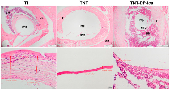 The histological analysis of the harvested bone tissue samples at 1 month post-implantation showed clear differences between the tested materials. As can be seen from Figure 10, the animal subjects with bare Ti implants showed minimal bone formation and a dense fibrous peri-implant tissue with variable thickness between 147.88–165.45 µm. In comparison to the flat Ti implant, the histological sections from animals that received TNT-modified Ti implants presented mild fibrous peri-implant tissue formation, but also bone matrix ossification with a thickness between 13.63–14.76 µm. In the case of the TNT-DP-Ica implants, minimal fibrous tissue formation and a more pronounced bone formation (thickness between 15.14–17.50 µm) could be observed. Moreover, it is worth mentioning that no inflammation could be observed for all of the analysed specimens, suggesting that the Ti-based implants are well tolerated by the organism.