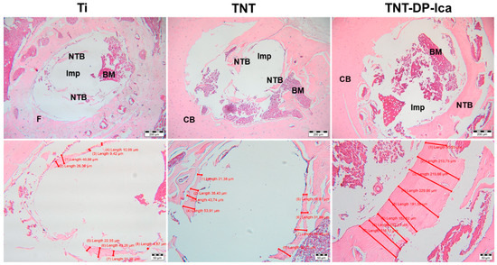 In comparison to the 1-month results, the 90-days histological sections (Figure 11) showed progressive new bone formation, visible especially in the subjects with bare Ti implants. In this case, the 30-days histological samples highlighted only the presence of a peri-implant fibrous tissue with no visible new bone formation, whereas at 90 days, the fibrous tissue was minimal, and the newly formed bone presented a thickness between 4.87–43.26 µm. Furthermore, bone formation was present in case of both surface-modified Ti-implants, with a difference of 147 µm in the averages of the newly formed bone tissue thicknesses (TNT-DP-Ica: 95.93–229.66 µm; TNT: 18.97–60.71 µm). In addition, no fibrous tissue could be observed in the subjects that received TNT-DP and TNT-DP-Ica implants. It is worth mentioning that all of the tested samples did not induce a foreign body reaction, therefore indicating that the implants continue to be well tolerated by the organism.