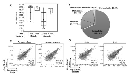 Overview of the implant proteomics data. The box plot shows the distribution of the number of proteins identified (≥2 peptides) per sample across the analyzed conditions, with an average value indicated with triangle (A). Scatter diagrams with regression lines showing the relationship between averages of the relative abundance of each of the identified proteins for eluates collected after 2 and 5 min exposure in situ (B), as well as eluates from smooth and rough surfaces are presented (C). A pie chart shows the subcellular localization of the identified proteins based on the data provided in Human Protein Atlas (D). Abbreviations: Avg. Abund.–ppm normalized protein abundance, R–coefficient of correlations, N–number of proteins included in the analysis (common proteins between the investigated conditions).