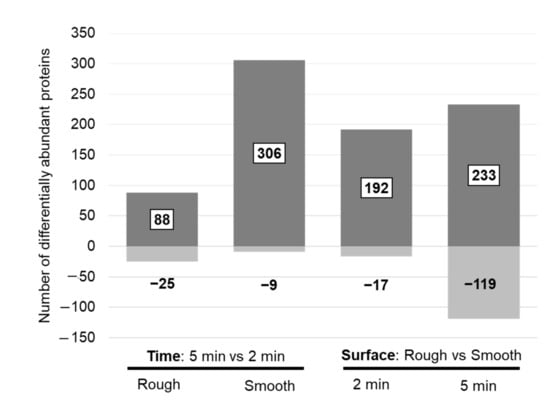 Number of differentially abundant proteins when comparing protein changes between two exposure times on a defined surface (left panel) and between surface properties at a defined time point (right panel). Discrimination for proteins with an increased (dark grey = up) and decreased (light grey = down) abundance in the “case condition” per comparison is given.