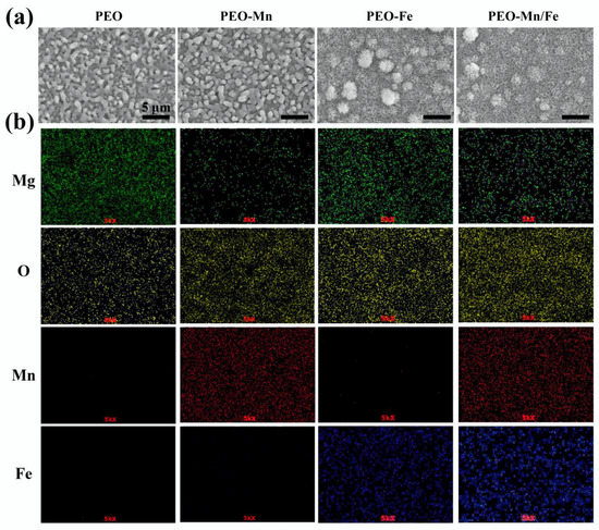 Surface views (a) and element distribution (b) of PEO, PEO–Mn, PEO–Fe, and PEO–Mn/Fe samples.