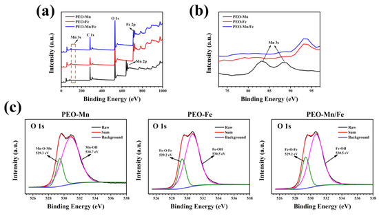 Full XPS spectra (a) and enlarged spectra (b) of PEO–Mn, PEO–Fe, and PEO–Mn/Fe samples. High-resolution XPS spectra of O 1 s of PEO–Mn, PEO–Fe, and PEO–Mn/Fe samples (c).