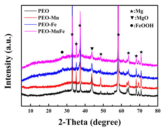 Both the formation of MnOOH and FeOOH can be ascribed to an alkaline-microenvironment-induced self-assembly process, as described in our previous studies [28,31]. Briefly, MgO, the main component of PEO film, is an alkaline substance that produces OH- near the coating. Generated OH- ions react with M2+ ions (M represents Fe and Mn) to form unstable M(OH)2. Finally, the M(OH)2 layers are oxidized by oxygen in the solution and MOOH is generated.