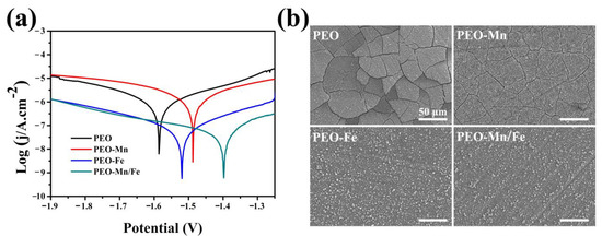 Potentiodynamic polarization curves (a) and corrosion morphology (b) of PEO, PEO–Mn, PEO–Fe, and PEO–Mn/Fe samples.