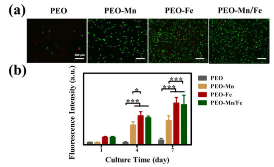 Live/dead staining (a) and cell proliferation (b) of C3H10T1/2 cells cultured on PEO, PEO–Mn, PEO–Fe, and PEO–Mn/Fe sample surfaces. (*: p < 0.05; ***: p < 0.001, and n = 4).
