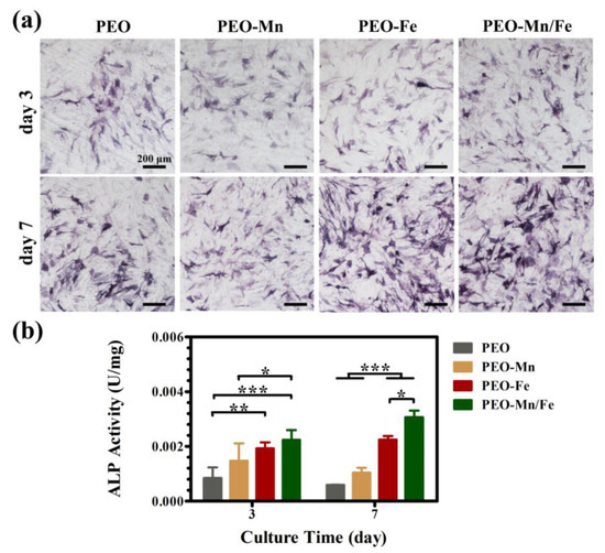 ALP activity in C3H10T1/2 cells cultured in PEO, PEO–Mn, PEO–Fe, and PEO–Mn/Fe extracts (a) and corresponding quantitative results (b). (*: p < 0.05; **: p < 0.01; ***: p < 0.001, and n = 4).