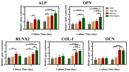 The expression of bone-related genes in C3H10T1/2 cells cultured in PEO, PEO–Mn, and PEO–Fe extracts. (*: p < 0.05; **: p < 0.01; ***: p < 0.001, and n = 4).