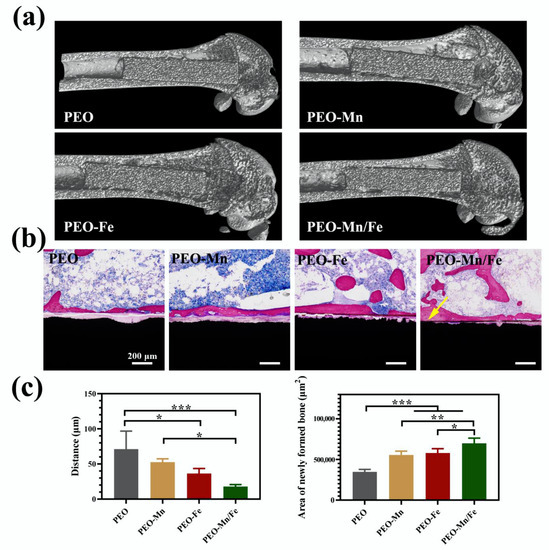 Representative Micro-CT images (a) and VG staining (b) of PEO, PEO–Mn, and PEO–Fe implants after 8 weeks of implantation. The quantitative analysis of gap distance between newly formed bone and the implants, and the area of newly formed surrounding the implants (c). (*: p < 0.05; **: p < 0.01; ***: p < 0.001). The yellow arrow in b indicates the closely adhesion between the newly formed bone and the implant.