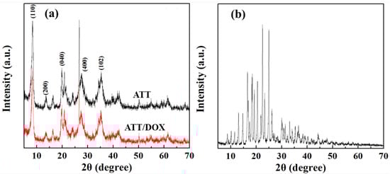 X-ray diffraction (XRD) was used to observe the crystalline structure of ATT before and after DOX loading (Figure 2). The characteristic diffraction peaks at 2θ of 8.34°, 13.70°, 19.88°, 27.64°, and 34.32° were assigned to (110), (200), (040), (400) and (102) crystal planes of ATT, respectively, according to the literature [,]. This indicates that the loading of DOX did not significantly change the crystal structure of ATT. The analysis of diffraction angle and plane spacing was also performed using XRD (Table S2). The loading of DOX caused the 2θ peaks in the (200) plane to vary from 13.70° to 13.58°, and in the (400) plane to vary from 27.64° to 27.58°. In addition, the plane spacing of (200) increased slightly from 6.459 to 6.515 A, indicating that the adsorption of DOX on the ATT surface occurs preferentially in the plane of (200). It is noteworthy that the XRD patterns of ATT/DOX showed no peaks related to DOX, probably because of the amorphous state of the loaded DOX.
