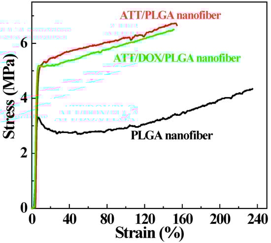 The strain–stress curves of PLGA, ATT/PLGA, and ATT/DOX/PLGA nanofibers, respectively.