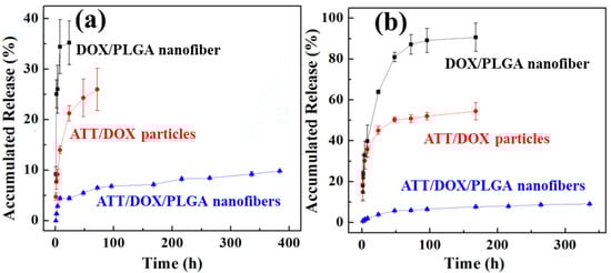 In vitro release of DOX from ATT/DOX complexes, DOX/PLGA and ATT/DOX/PLGA nanofibers at pH 7.4 (a) and 5.5 (b), at 37 °C.