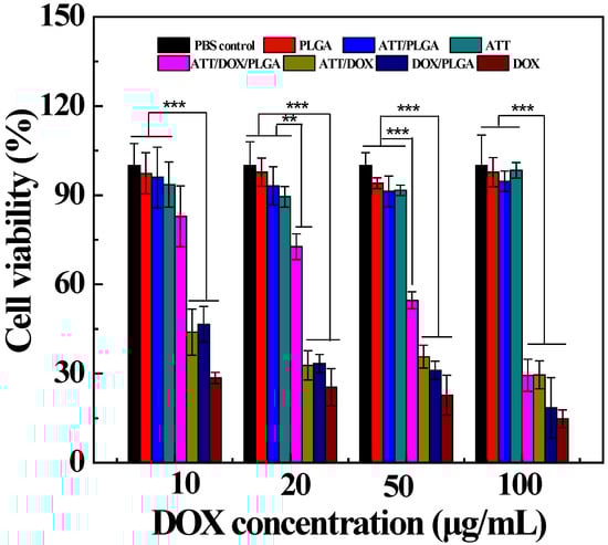 Cell suspension with a density of 1 × 105 cells/mL was prepared, and 20 μL was added to a 96-well plate, so that the plating density of CAL 72 cells was 2 × 103 cells/well. Samples used for testing were: 100, 50, 20, or 10 μL fresh medium, free DOX solution ([DOX] = 200 μg/mL), ATT/DOX solution ([DOX] = 200 μg/mL), ATT particle solution with equivalent concentration of the ATT/DOX complexes, and immersion medium of the nanofibers of DOX/PLGA ([DOX] = 200 μg/mL according to theoretic DOX loading within the fibers), PLGA with equivalent DOX concentration of the release medium of DOX/PLGA, ATT/PLGA with equivalent DOX concentration of the release medium of DOX/PLGA, and ATT/DOX/PLGA ([DOX] = 200 μg/mL according to theoretic DOX loading within the fibers). The total volume was added to 200 μL/well using fresh medium. Each sample and concentration gradient were stored six parallel, and the samples were shaken well and then cultured in an incubator. The initial concentration of DOX is 200 μg/mL, so the concentration gradients after dilution were 100, 50, 20 and 10 μg/mL, respectively. After one day of culture at 37 °C and 5% CO2, the original medium was discarded, and 180 μL fresh medium and 20 μL resazurin solution added into each well (0.1 mg/mL dissolved in PBS and filtered for sterilization). Four hours after re-culture, cell viability was detected by a microplate reader (model Victor3 1420, PerkinElmer, Waltham, MA, USA). Meanwhile, the morphology of the treated cancer cells was observed by an inverted optical microscope (Nikon Eclipse TE 2000E, Tokyo, Japan).