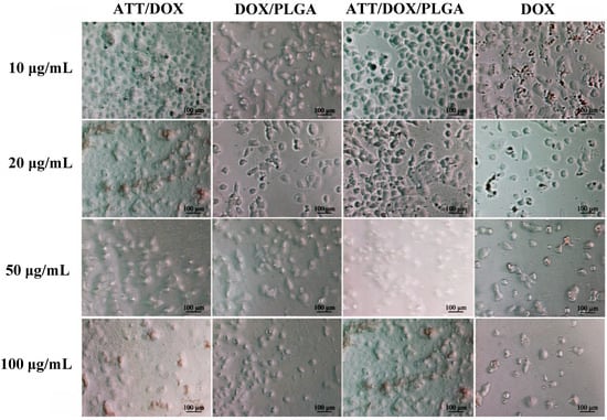 To further confirm in vitro antiproliferative activity of the drug-loaded nanofibers, the morphologies of cells treated with free DOX, or the release medium of ATT/DOX complexes, ATT/DOX/PLGA nanofibers, or DOX/PLGA nanofibers were observed by phase-contrast microscopy for 24 h (Figure 8). They all had a large number of rounded and disconnected cells, indicating that a large percentage of the cells had died. In addition, the proportion of rounded dead cells increased with the increase in the concentration of DOX. These results were consistent with the resazurin reduction assay data.