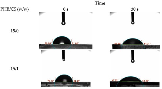 To evaluate the surface hydrophilicity of the PHB/CS nanofibrous mats with different CS contents, the water contact angles (WCA) on the PHB/were measured consecutively as shown in Figure 4. PHB/CS0 showed the highest contact angles at 89°. With the increasing CS contents, contact angles reduced to 65°.