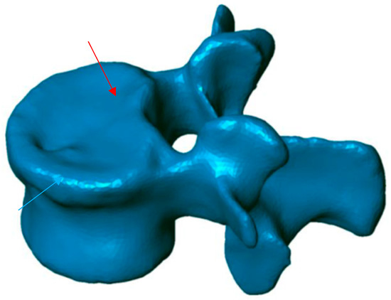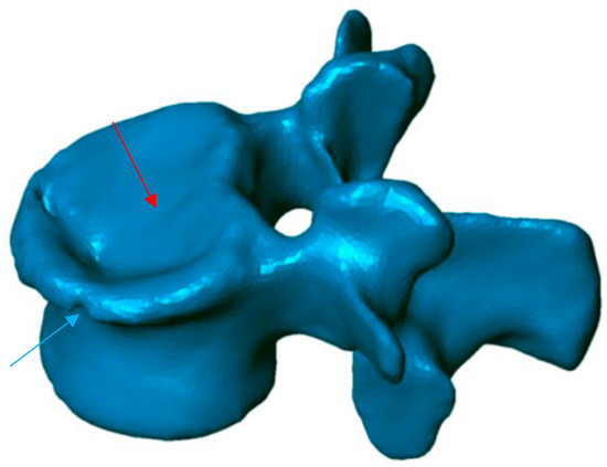Preoperative 3D reconstruction. Sinking of the entire upper vertebral endplate (red arrow), with involvement of the cortical ring (blue arrow).