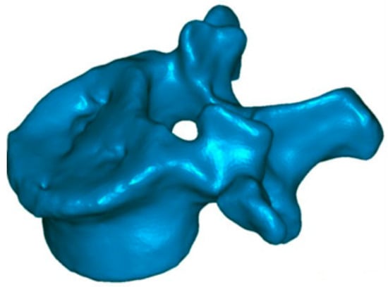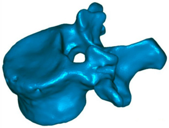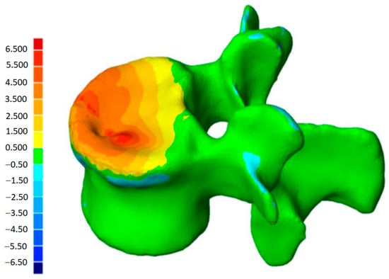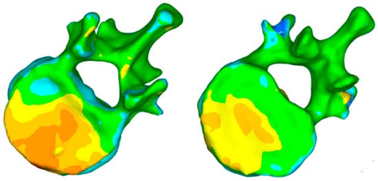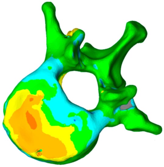 This method has been validated previously [38,39,40]. It permits comparing, in 3D, two vertebral reconstructions. Once the two 3D reconstructions were obtained for the same vertebra, before and after the intervention, they were superimposed (Figure 3). The posterior arch was affected by neither the VCF nor by the surgical procedure. The two 3D reconstructions are compared by calculation of the distance between the same point belonging to the vertebral body surface. These calculations can be presented by color-coded 3D mappings, in that the calculated distance is represented for any point with a specific colour depending on the measured value.