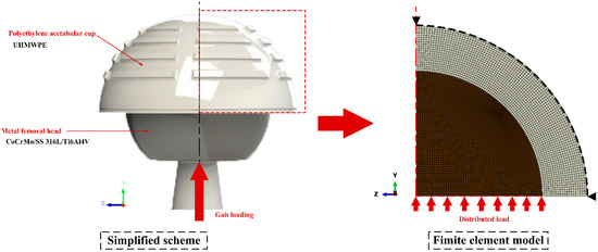 Simplified scheme and finite element model of Metal-on-UHMEPE couple bearing.