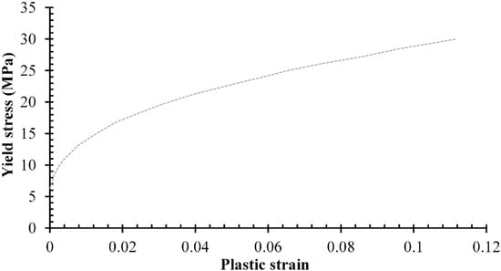 Young’s modulus and Poisson’s ratio were used to define the mechanical properties of the investigated material for computational simulation needs, as presented in Table 1. All materials were assumed to be homogeneous and isotropic, but linear elastic for metals and non-linear plastic for UHMWPE. The definition of non-linear plastic in UHMWPE material for the acetabular cup component uses the relationship between plastic strain and yield stress described in Figure 2.