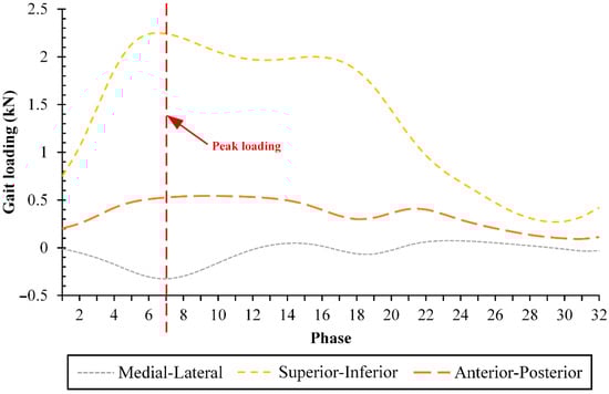 One gait cycle was applied to the current computational model. The rationale for this is because most activities carried out by patients after hip joint replacement surgery are walking for the first time [29]. In adopting the gait cycle, the current study takes the magnitude of triaxial forces (medial–lateral, superior–inferior, anterior–posterior) as shown in Figure 3 from a previous study conducted by Jamari et al. [24] which provides a full gait cycle divided into 32 phases to simplify calculations, but without considering the range of motion as done by Basri et al. [30]. The largest resultant value was in the 7th phase of 2326 N, with superior–inferior forces dominating.