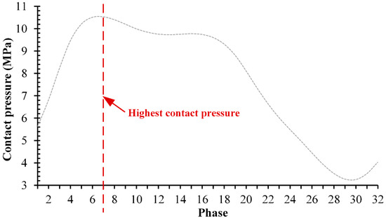 The maximum contact pressure of CoCrMo-on-UHMWPE from each phase under the gait cycle.