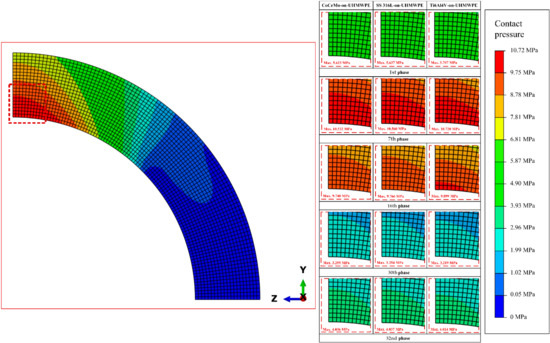 Furthermore, the calculation of cumulative contact pressure at each node along the contact interface of the UHMWPE acetabular cup on current two-dimensional axisymmetric is presented in Table 5. Although the highest contact pressure of 10.720 MPa is in the 7th phase by Ti6Al4V-on-UHMWPE, it has the lowest cumulative contact pressure of 375.404 MPa relative to the other studied metal-on-UHMWPE bearings. Compared to Ti6Al4V-on-UHMWPE at peak loading, the difference in cumulative contact pressure to respective maximum contact pressure is 9.740% for SS 316L-on-UHMWPE and 11.038% for CoCrMo-on-UHMWPE.