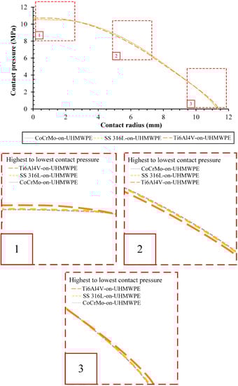 The distribution of contact pressure on the interface contact of UHMWPE acetabular cup in the 7th phase was studied by correlating contact pressure and contact radius described in Figure 7. Along with the distribution of contact pressure on UHMWPE acetabular cup, at the contact centre (see point number 1 in Figure 7) it can be seen that the highest contact pressure is experienced by Ti6Al4V-on-UHMWPE, followed by SS 316L-on-UHMWPE and CoCrMo-on-UHMWPE. Furthermore, at the middle contact radius (see point number 2 Figure 7) it can be seen that CoCrMo-on-UHMWPE has the highest contact pressure, followed by SS 316L-on-UHMWPE and Ti6Al4V-on-UHMWPE. At the end of contact (see point 3 Figure 7) it can be seen that the order of highest contact pressure returns to the same as a contact centre. Contact radius on the 7th phase for every material combination is shown in Table 4. This result is due to the soft characteristics of UHMWPE material in contact with harder metallic materials, indicated by the different values of Young’s modulus for UHMWPE and metallic materials.