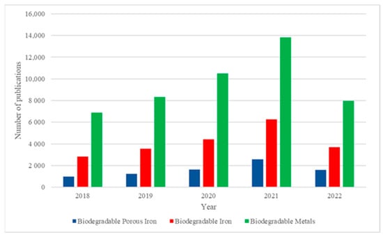 Number of publications related to biodegradable metals, iron and porous iron from 2018 until 2022 according to science direct database (data obtained in 17th of April of 2022). A steady increase in the number of publications indicates growing interest in the field of biodegradable iron biomaterials.
