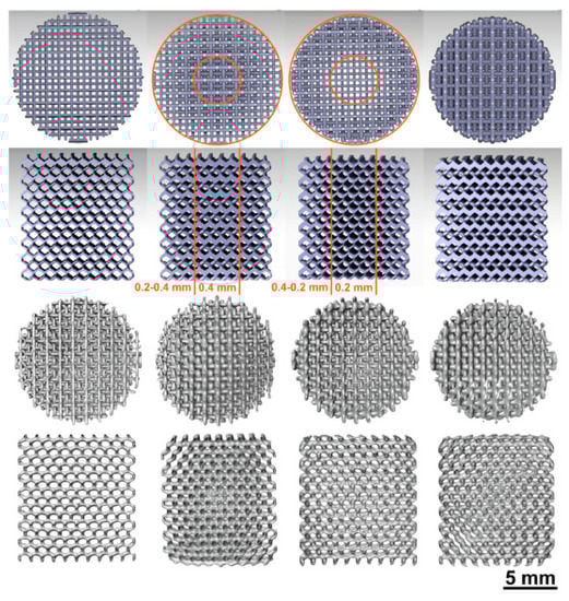 Illustrations of topological designs. Left to right: S0.2, Dense-in, Dense-out, S0.4. Top to bottom: top view and longitudinal cross-section obtained from CAD models, top view and longitudinal cross-section of the micro-CT reconstructions of the AM porous individuals (Reprinted with permission from Ref. [29]. Copyright @ 2019, Elsevier).
