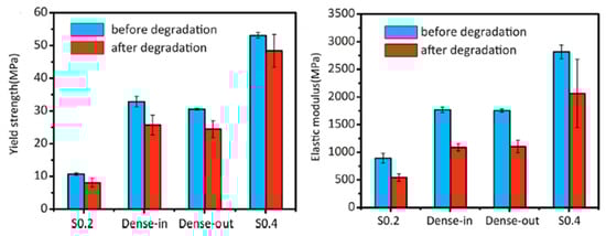 Mechanical properties of iron scaffolds comparison of before and after 28 days of degradation. (Reprinted with permission from Ref. [29]. Copyright @ 2019, Elsevier).