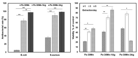 Antibacterial rate and cell viability of Fe-30Mn, Fe-30Mn-1Ag and Fe-30Mn-3Ag (*** is p < 0.001, ** represents p < 0.01 and * is p < 0.05) (Reprinted with permission from Ref. [10]. Copyright @ 2018, Elsevier).