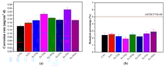 (a) Corrosion rate after 30 days in dynamic immersion in Hank’s solution and (b) hemolysis percentage of the iron-based materials (Reprinted with permission from Ref. [12]. Copyright @ 2015, Wiley Online Library).