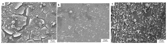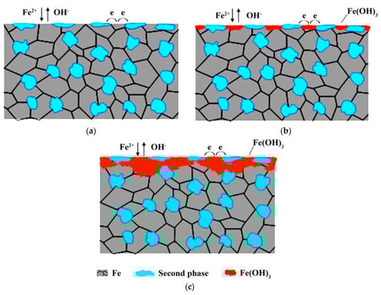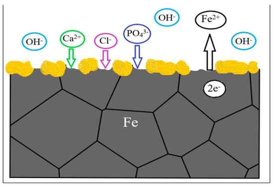 The corrosion mechanism proposed by the authors was mainly electrochemical corrosion with galvanic cells formation, which accelerates the corrosion rate of pure iron, as illustrated in the schematic representation presented in Figure 8 [12]. Between the iron matrix and Au or Ag, the iron acts as an anode, the iron matrix was oxidized into iron ions. Dissolved oxygen consumed the electrons generated by the oxidation of the iron matrix [12]. Ag and Au’s solid phases alkalinized the surrounding solution, promoting the formation of iron hydroxide (Figure 8b). Due to the instability of ferrous hydroxide, it becomes ferric hydroxide with the dissolved oxygen from the solution [12]. With the penetration of the solution under the Au and Ag solid phases, uniform corrosion with microgalvanic corrosion couples occurs [12].
