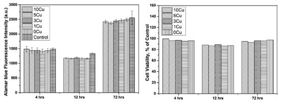 Alamar blue and cell viability of MG63 for Fe-Mn-Cu alloys (Reprinted with permission from Ref. [11]. Copyright @ 2019, Elsevier).