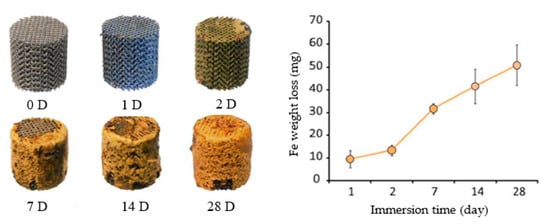 - Sharma, P.; Pandey, P.M. Corrosion behaviour of the porous iron scaffold in simulated body fluid for biodegradable implant application. Mater. Sci. Eng. C. 2019, 99, 838–852. [Google Scholar] [CrossRef] [PubMed]